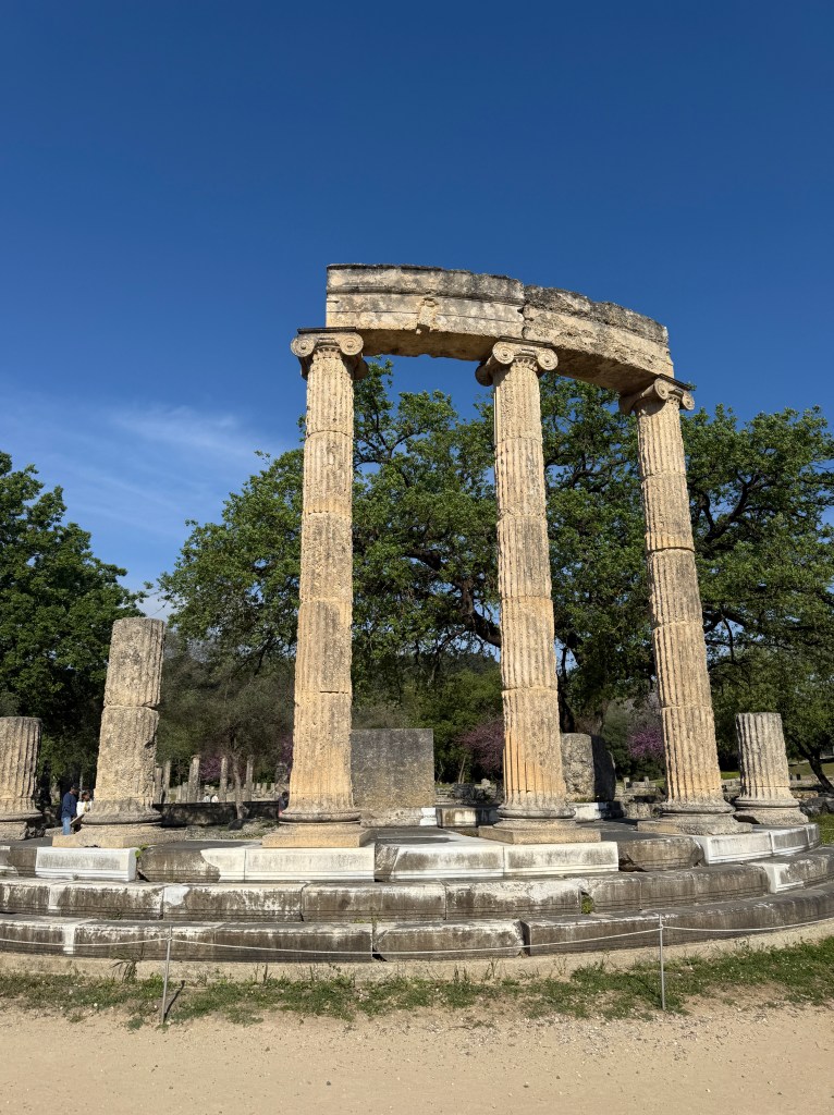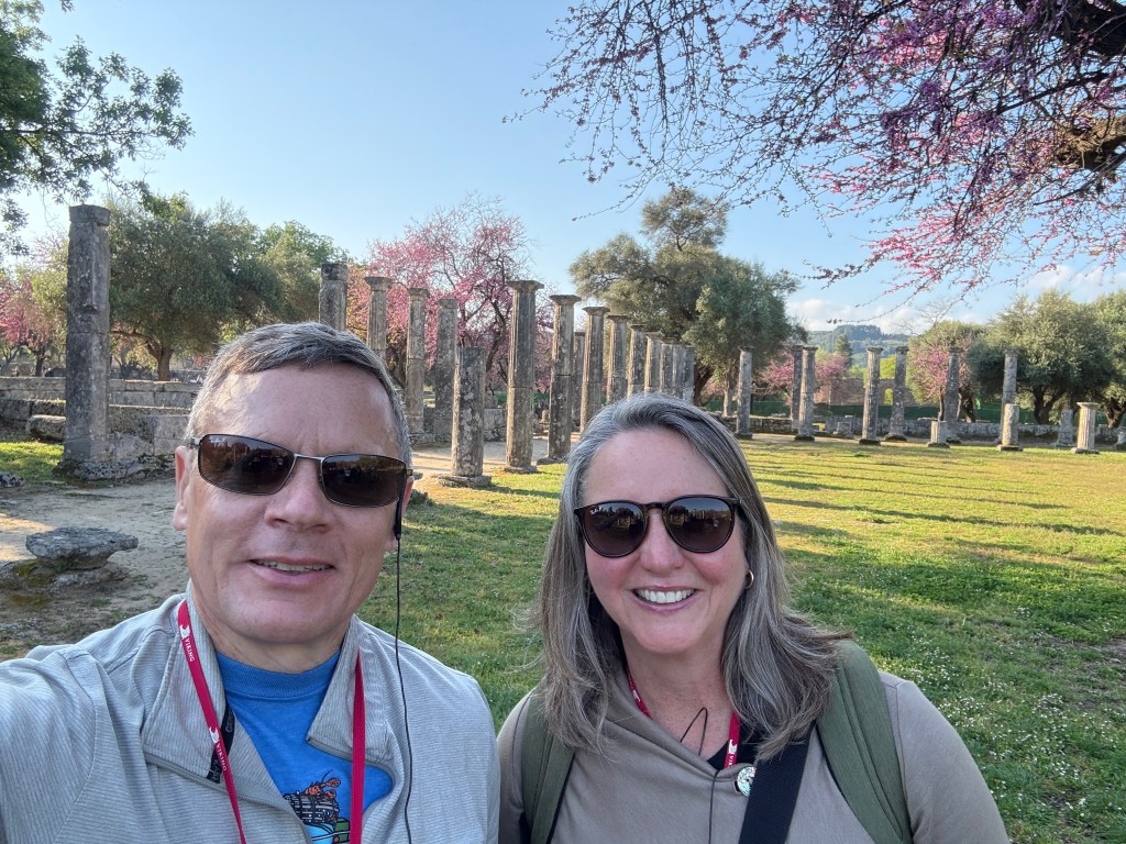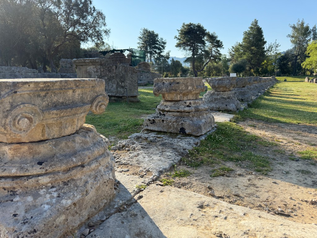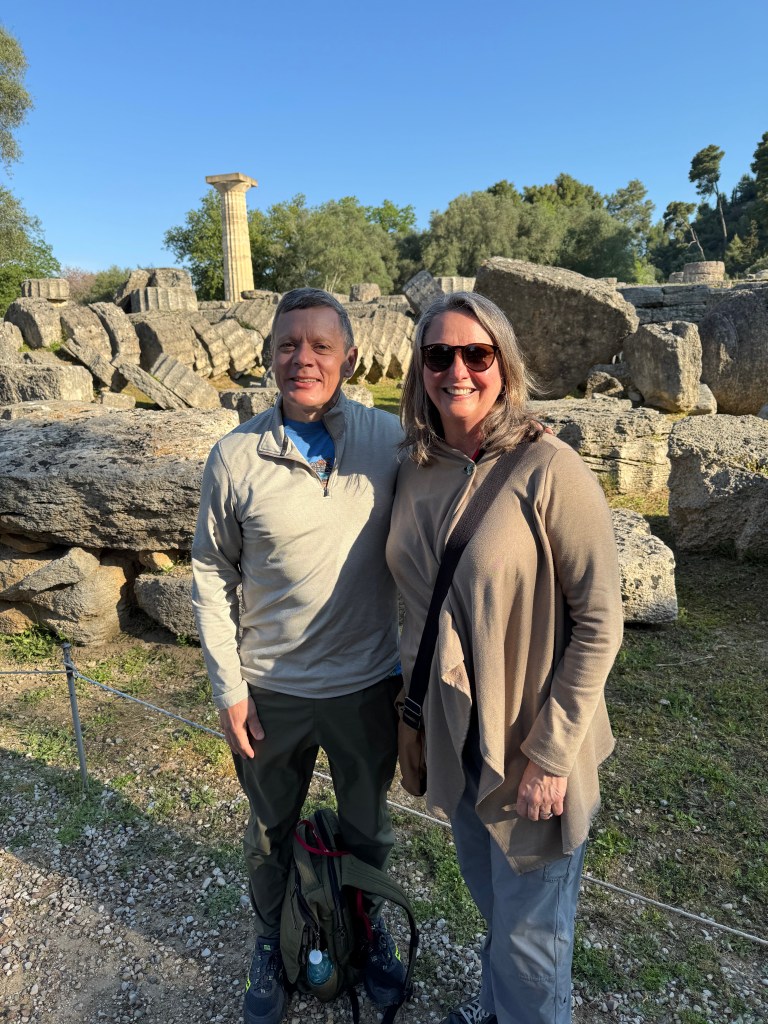 We were amazed at how up close you can get with the ruins of Archaia Olympia (Ancient Olympia). It is the site of the original Olympic Games from the 700s. We stood on the starting line in of the running events in the original stadium. We learned the athletes in the early games competed naked. The games were a display of human beauty and performance, both physical and moral. At the entrance to the stadium, there were 16 ancient pedestals. They once displayed bronze statues of competitors caught cheating in the games. These served as a warning for all future athletes as they entered the tunnel to the stadium. We would need a few more pedestals at the modern Olympic sites.
