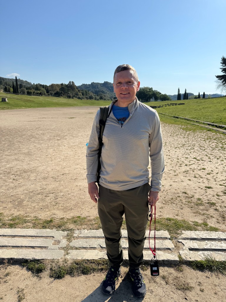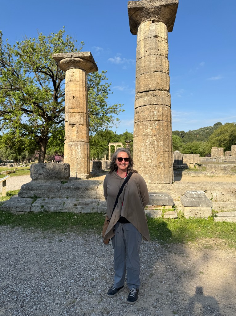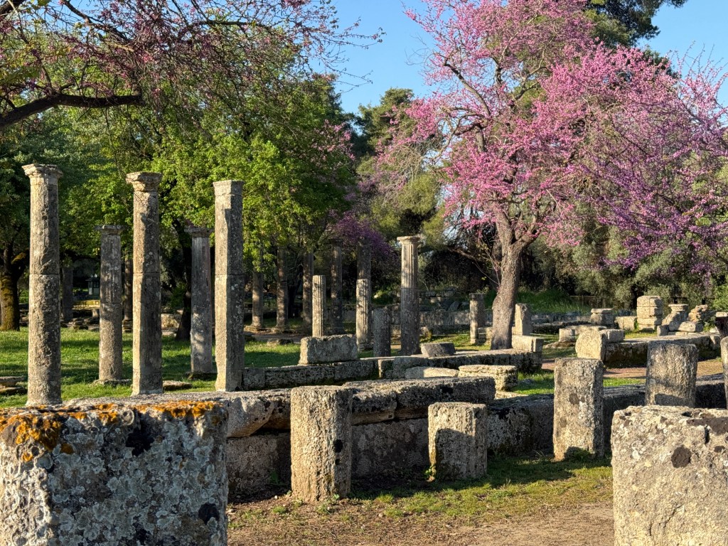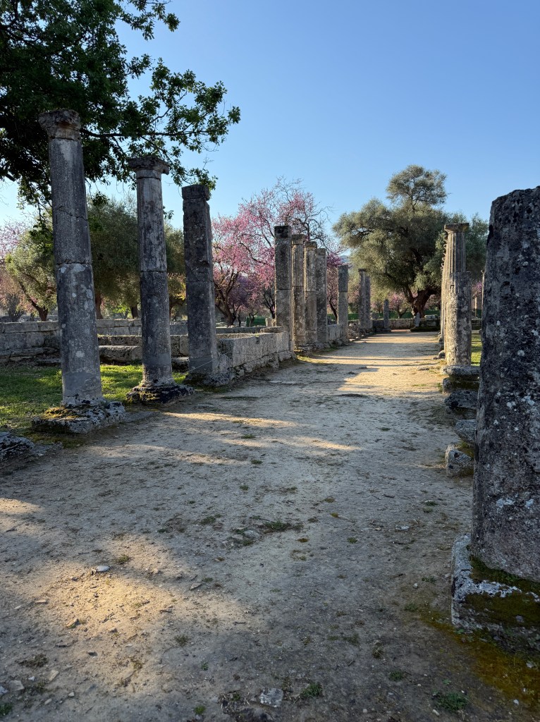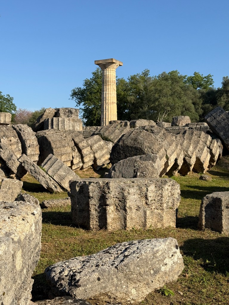 We were amazed at how up close you can get with the ruins of Archaia Olympia (Ancient Olympia). It is the site of the original Olympic Games from the 700s. We stood on the starting line in of the running events in the original stadium. We learned the athletes in the early games competed naked. The games were a display of human beauty and performance, both physical and moral. At the entrance to the stadium, there were 16 ancient pedestals. They once displayed bronze statues of competitors caught cheating in the games. These served as a warning for all future athletes as they entered the tunnel to the stadium. We would need a few more pedestals at the modern Olympic sites.